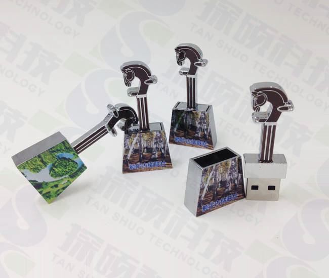 馬頭琴,是蒙古族最具代表性的樂器之一,深受草原人民的喜愛。馬頭琴U盤是額爾古納市農(nóng)村信用合作聯(lián)社設(shè)計開模制作,外形參照馬頭琴的形狀,進行了藝術(shù)加工。U盤整體由琴柄和琴箱兩部分構(gòu)成,琴柄表面經(jīng)滴油工藝,琴箱上所繪為蒙古族傳統(tǒng)紋樣和公司logo,十分精美細致。琴柄和琴箱可分離,琴柄下部即為U盤主體,可與USB接口連接,琴箱為U盤外套蓋。馬頭琴U盤創(chuàng)意性地實現(xiàn)了傳統(tǒng)風(fēng)格與現(xiàn)代理念的有機結(jié)合,是一款值得收藏的紀念品U盤。