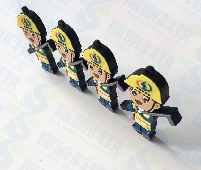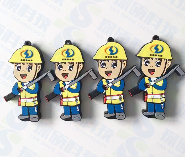 小人造型U盤 成都供電局開模定做供電工人U盤紀念品,這款水電工U盤是我們探碩U盤工廠設計定制,采用環保PVC材質制作,平面2d開??睿ㄍㄈ嗽煨?,正面是帶著安全帽的水電工形象,黃色的安全帽,還有電工常用的工具,站立的電工一身工作服,非常的嚴肅,這也是日常生活中電工的具體形象,安全帽上有成都供電段5個漢字,還有供電所logo標志,電工U盤非常形象的展示了電工的風采。