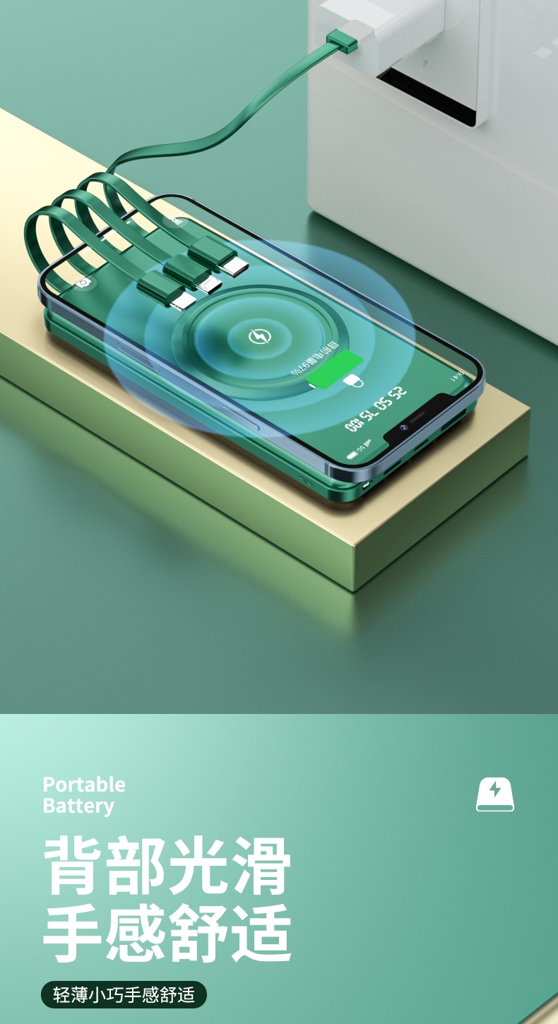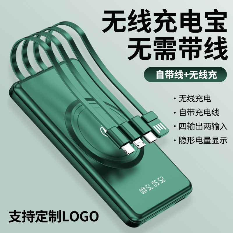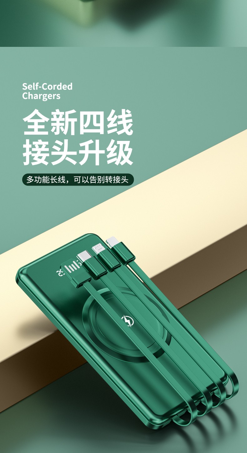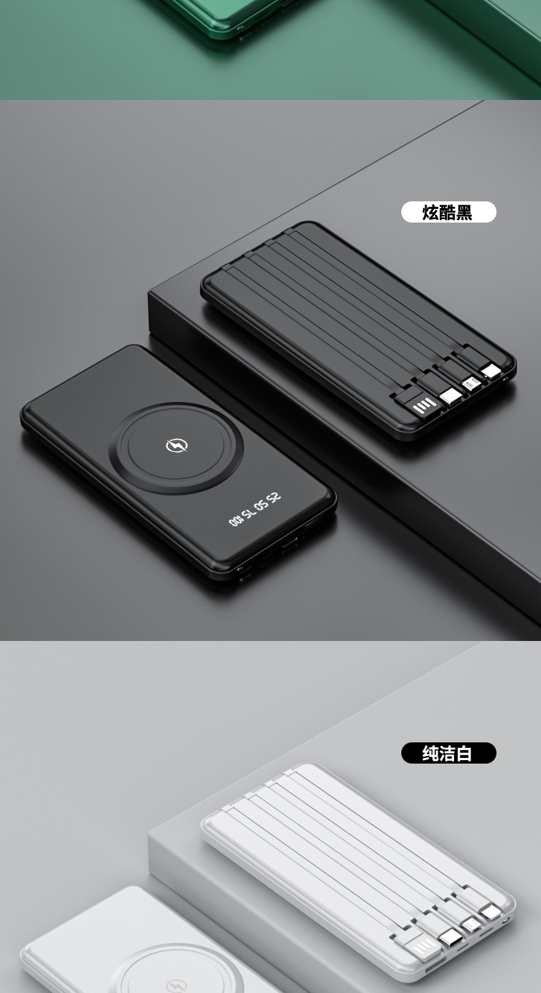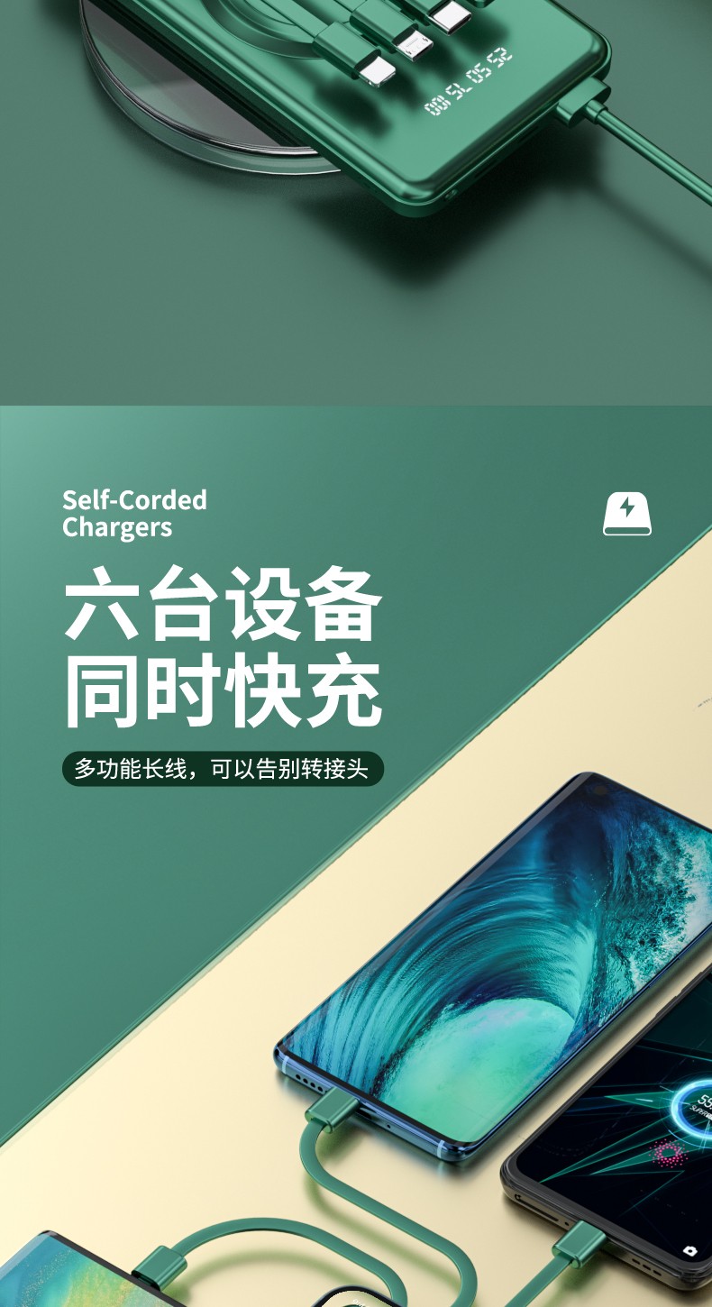 產品功能:無線充+自帶四條線,4輸出1輸入,外加單USB輸出和Micro、Type-c輸入;電量數字顯示,自帶強光手電筒