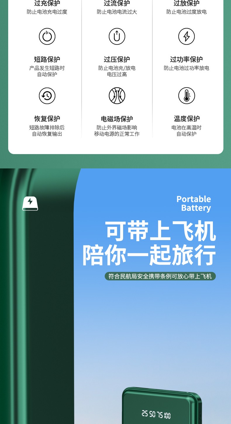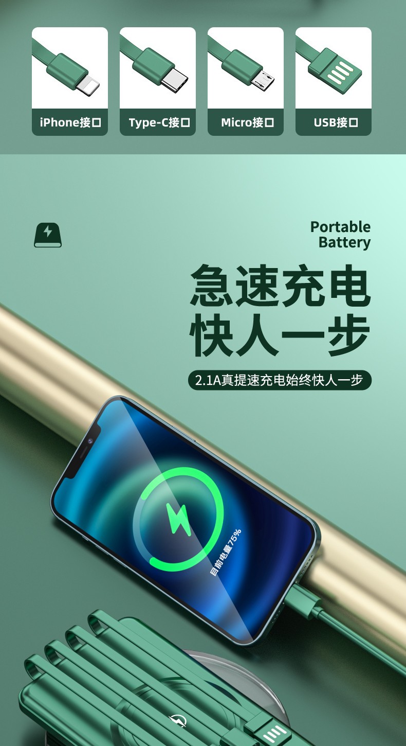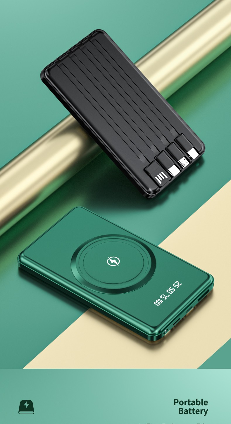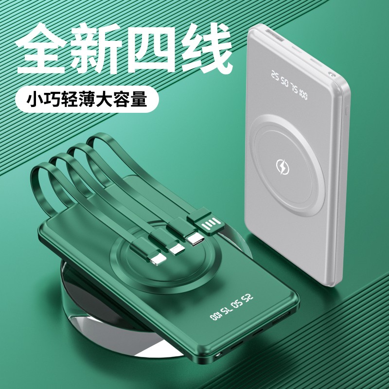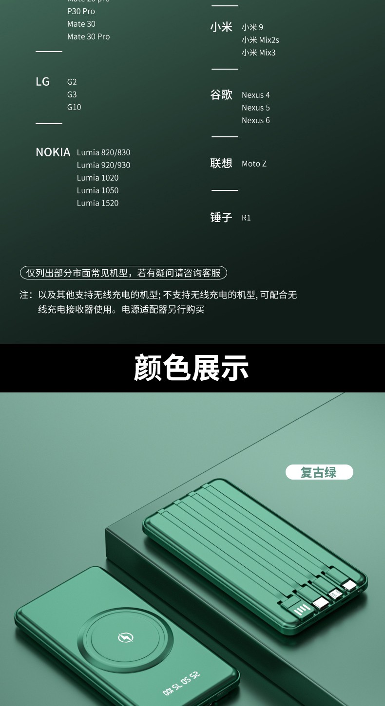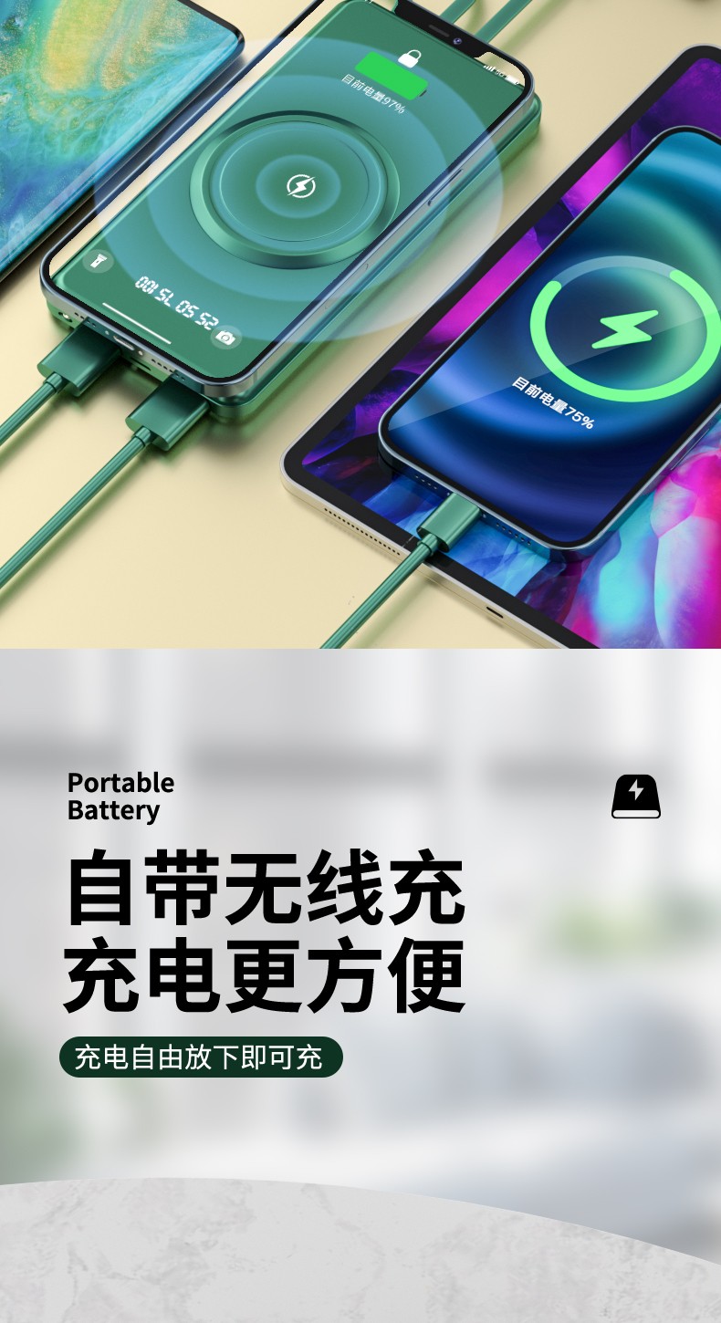 產品功能:無線充+自帶四條線,4輸出1輸入,外加單USB輸出和Micro、Type-c輸入;電量數字顯示,自帶強光手電筒