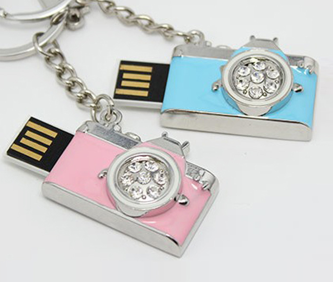 這款相機珠寶U盤,外形精致逼真,金屬部分采用鋅合金電鍍工藝制作,光滑平整,正面粉紅、藍色色等部位則是滴油工藝制成,加上水晶鉆石作為點綴,時尚可愛,精美絕倫!